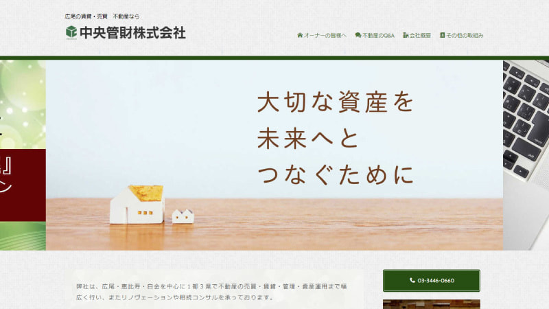 広尾の物件を扱っている不動産業者としての企業ホームページと、レンタルオフィス事業のサービス案内や空き状況を伝えるための2つの役割を持つホームページ。